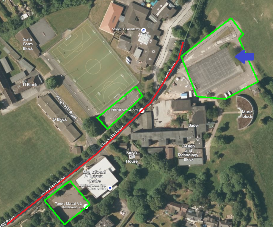 Alternative parking areas are available next to the astro pitch and at the top of Kings Hill Road and on the school tennis courts, as shown on the below aerial photo.